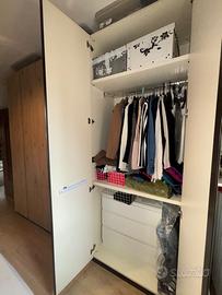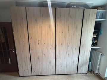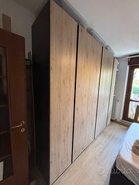 Vendo armadio a 6 ante rovere e struttura antracite con bastoni appendiabiti e mensole. In ottime condizioni, completo di 2 cassettiere Malm Ikea.