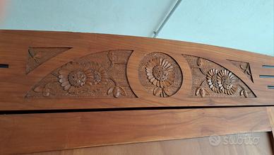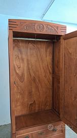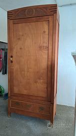 Vendesi elegante armadio a un'anta in legno dalle tonalità calde, caratterizzato da un design sobrio ma ricco di dettagli artigianali. Il mobile è composto da un ampio vano superiore e un pratico cassettone alla base. Stile Eclettico, con influenze Art Déco (visibili nelle linee geometriche orizzontali ai lati del cappello) e richiami Liberty/Floreali nel fregio superiore intagliato a mano. Cappello a corona. Splendido intaglio centrale con motivi floreali e solari. Risale a circa labmetà 1900 e restaurato nel 2010. Maniglie del cassetto in metallo lavorato e pomello dell'anta con mostrine a fiore. Pannello centrale dell'anta con venature a vista. Il mobile si presenta in buone condizioni generali.