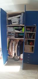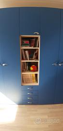Armadio Moretti Compact , 4 ante con porta abiti e 3 scaffali per parte, piu' anta centrale con libreria e 4 cassetti, piu' libreria/portaoggetti laterale con 7 mensole.
