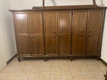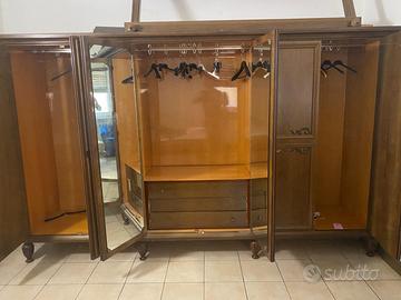 Armadio noce 6 ante con cassettiera interna e specchio. A completare cassettone con specchiera e 2 comodini. Ritiro e smontaggio a carico acquirente.