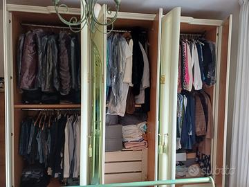 ANTE DELL'ARMADIO CON SPECCHI IN CRISTALLO MOLATI ED INCISI, CON VETRI LAVORATI E TENDINE DI TESSUTO ROSA, CAPITELLI DORATI A “FOGLIA ORO", DECORI CON FILETTI DI COLORE "BOIS DE ROSE" E DORATI.