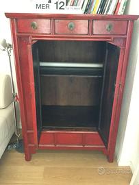 Armadio di artigianato antico cinese, laccato rosso con tre cassetti, un ripiano e fondo nascosto.
