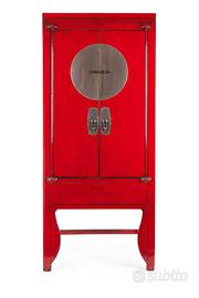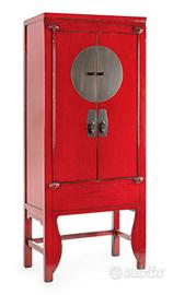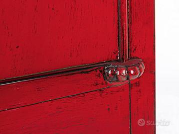 Classico Mobile cinese etnico nuziale in lacca rossa lievemente antichizzata decapata, struttura in legno massello di cipresso schienale e pannelli interni in compensato pesante Finitura finale lucida e patinata a base d'acqua.