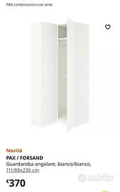 Vendo Armadio Pax angolare bianco Ikea. Con inclusi bastoni appendi abiti e ripiani interni altezza 236