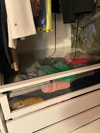 Composto da due strutture cm100x236 (si possono anche utilizzare divise), 6 cassetti (di cui uno di vetro), 4 ripiani (di cui uno di vetro), due aste appendiabiti e un porta pantalone scorrevole.