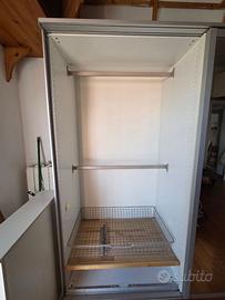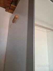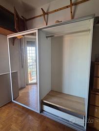 Armadio Ikea Pax bianco. 2 ante scorrevoli con un'anta a specchio. Comprensivo di 3 barre appendiabiti, 1 cassetto e 2 piani. Secondo cassetto (da montare) in omaggio. Piccolo foro nella parte posteriore in basso a sinistra, applicazione in legno da rimuovere sul lato sinistro. Per ulteriori informazioni lasciare un messaggio su Subito.