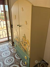 Solido armadio ditta Erbesi per cameretta bimbi con decorazioni di orsetti, girasoli e farfalle. Due ante e due casetti. Scomparti interni modulabili. Due aste appendiabiti. Dimensioni 100x60x180 (nel punto più alto). Usato ma in condizioni buone, con qualche piccolo graffio. Ottimo per arredare case vacanze. Visionabile e ritirabile solo previo appuntamento.