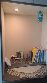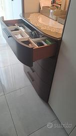 colore bianco e bordi marrone scuro. misure lunghezza 3,30 x 62 cm. ante laterali con 1 solo sportello ai lati della cassettiera centrale ci sono 2 ampie ante a dx e sx.