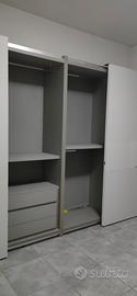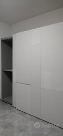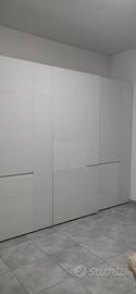 Armadio Pianca quattro ante scorrevoli in vetro bianco lucido e opaco, con cassettiere. Il motivo geometrico delle ante crea un ritmo di superfici vetrate lucide ed opache: rettangoli di varie dimensioni e proporzioni che si alternano e si accostano.