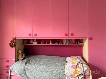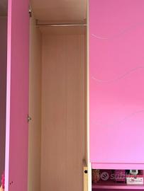 vendo armadio a ponte per cameretta, in ottime condizioni, ideale per bambine o ragazze. colore rosa vivace con dettagli ondulati sulle ante. Struttura molto capiente con 6 ante, scaffale centrale e porta libri/giocattoli e cassetti laterali.