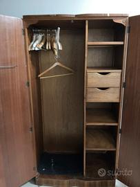 Splendido armadio compatto a due ante in piuma di radica di noce, marca Shrager, stile Art Decó anni 30. Internamente ci sono due cassettini, ripiani, asta appendiabiti e portacravatte. Maniglie decorate e dettagli in ottone, fregio in bachelite. Splendida fattura inglese. Prezzo trattabile.