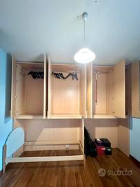 Ampio armadio rialzato in compensato simil legno di ottima qualita, in perfette condizioni se non per una leggera imperfezione in uno dei 9 pannelli del fondale dell’armandio che risulta senza guarnizione.