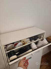 L'armadio è composto da 2 pezzi, uno armadio/scarpiera e l'altro pezzo solo scarpiera con doppi ripiani. I due pezzi possono essere posizionati vicino per comporre un unico armadio oppure separati.