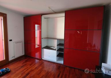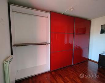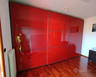 Ante specchiate colore rosso bordò. Profili, mensole, ripiani e struttura in legno wenge'. Cassettiera interna.