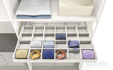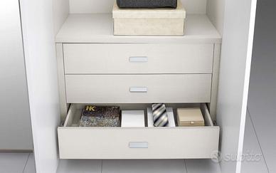 Vano centrale: tre ripiani, cassettiera a tre cassetti, porta-accessori scorrevole.