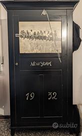 Vendo armadio shabby chic / pop art con stampa e dettagli artigianali, usato in buone condizioni con piccole ammaccature.. Oggetto unico e introvabile! H 187 cm, L91, P 47. La parte alta (capello) misura L 105, P 54 L'armadio si trova a Milano in zona Niguarda. mobile NON smontabile! trasporto a carico del acquirente. Valuto proposte permuta.. Qualsiasi domanda.