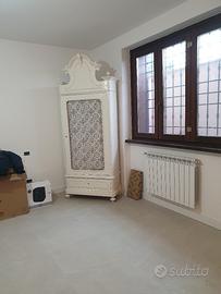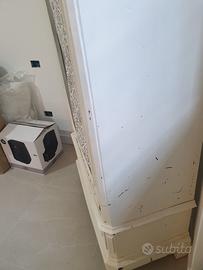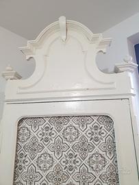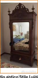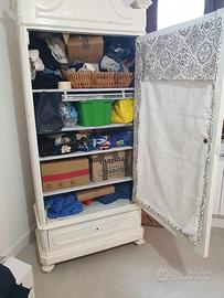 Armadio antico originale fine '800 Stile Luigi Filippo con una anta per specchio in legno massello pitturato bianco shabby con 4 ripiani e un cassettone capiente. Esclusa la tela sullo sportello. Nell ultima foto ho messo un esempio simile di come era prima della pittura e con lo specchio che ora non c è.
