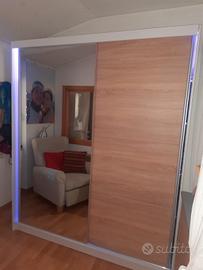 vendo armadio guardaroba bianco e rovere.2 ante scorrevoli di cui una a specchio.. striscia interna luci LED multicolore..5 grandi ripiani. misure 215X180X58.trasporto a carico dell'acquirente.