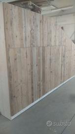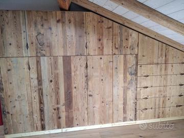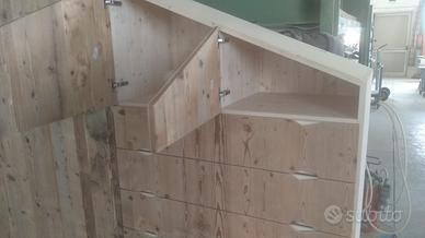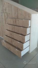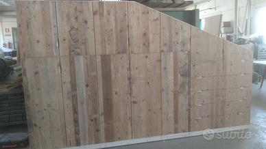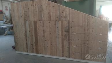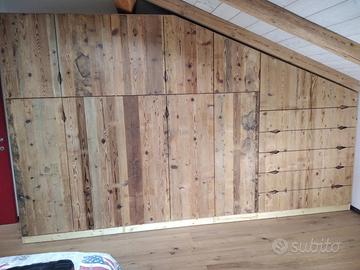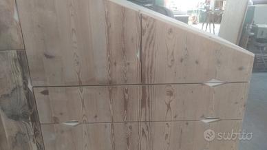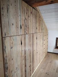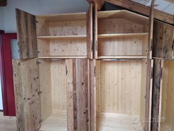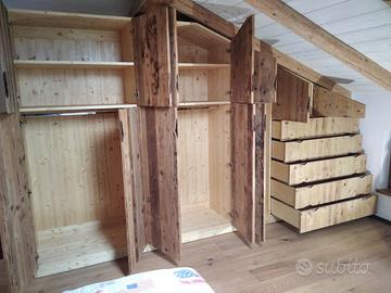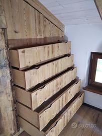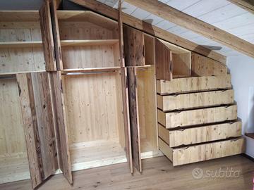 armadio costruito con tutta struttura fianchi verticali e orizzontali tutto in abete massello nuovo spazzolato in cui ripiani da 24 mm fondo e cappello da 20 mm schienale posteriore da 14 mm con fascia perimetrale alle estremità per dare robustezza al tutto, le ante costruite a 3 strati con multistrato interno e rivestito ambo i lati con cartelle da 7 mm per bilanciare il tutto. Misure lungh. 360 prof. 60 h 220/139 disposto con vano da 100 sopra bastone porta abiti in alluminio, vano laterale da 100 sempre con bastoni (2+2 ante doppie sx e dx) vano da 50 cm con porta bastoni superiore chiuso con 1 anta. Ultimo vano da 117 circa con 5 cassetti che scorrono su guide ammortizzate in chiusura sponde da 16 e fondo da 6 in betulla. Parte superiore con 2 ante per ogni modulo da 100 cm con ripiano interno aggiustabile. 2 ante da 50 cm e sopra ai cassetti che si apriranno su cerniere da cucina regolabili ammortizzate in chiusura. Le ante saranno costruite a 3 strati in ABETE VECCHIO RECUPERATO con venatura orizzontale apertura a gola fresata piccola al centro, interno in multistrato di pioppo per avere una bilanciatura omogena nel tempo, piedini livellatori per mettere a bolla il tutto, varia ferramenta con spine in legno e ferro con vari barilotti. Finitura cerata per ante in legno vecchio e olio per abete nuovo. il mobile è già stato prodotto su commissione del cliente ma possiamo riprodurlo uguale o con misure diverse dato che siamo i diretti produttori falegnami. per noi conta dare vita alla vostra idea. DIRETTAMENTE DAL PRODUTTORE. ASTENERSI RIVENDITORI E COMMERCIANTI