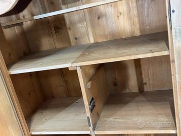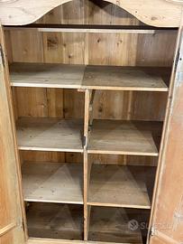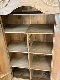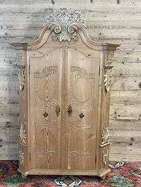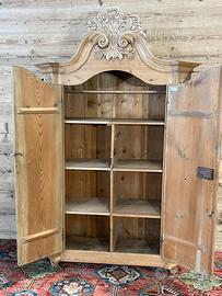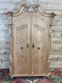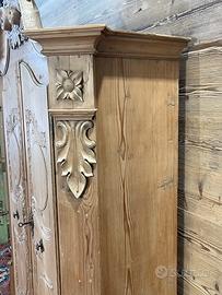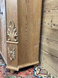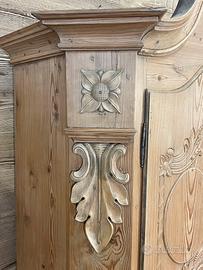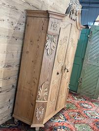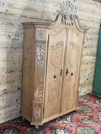 Armadio intagliato della prima metà del 1800, in abete e acero. In buone condizioni, ma non restaurato. Alcune parti sono state integrate o sostituite durante i restauri subiti nel tempo.