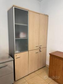 Armadio da ufficio colore legno chiaro con ante battenti (una con vetro satinato) e chiusura con chiave.
