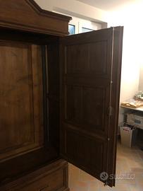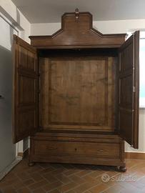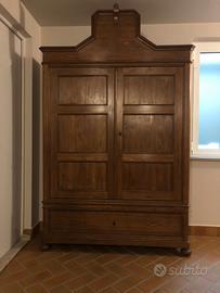 Armadio vecchio, restaurato, in legno massello, anche il pannello posteriore, di noce e rovere, con cassettiera. Non è tarlato. Altezza cm. 230, Lunghezza cm. 150, Profondità cm. 50. Ritiro solo in loco, non spedisco.