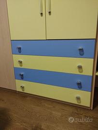 Ampio armadio 5 ante, l'anta centrale ha uno specchio all' interno. 3 Aste appendiabiti. Al centro si possono appendere abiti lunghi. Nelle due parti laterali è presente asta e ripiano.