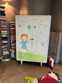 Armadio per bambini con ante a battente, con ripiani movibili e asta per appendere indumenti. Decorabile a piacimento. Utilizzato per stanza da gioco e studiolo bambini per riporre giocattoli, libri e indumenti. Dimensioni 185 cm (altezza) ; 81 cm (larghezza) ; 51 cm (profondita’). Ottime condizioni. Cedo per ristrutturazione dell’arredamento.