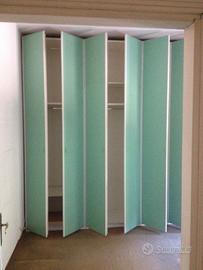 Vendo armadio usato a 9 ante col. verde chiaro misure cm 400x 60x 290h con ripiani interni e tubi acciaio appendiabiti.