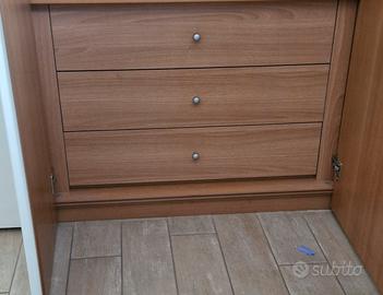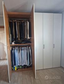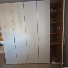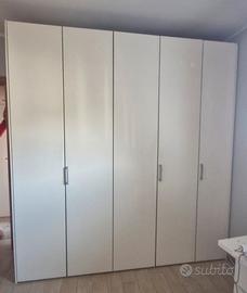 Armadio 5 ante, bianco liscio, interno finitura legno, 2 ripiani interni con 3 aste appendiabiti abiti in totale, cassettiera con 3 cassetti, ultima anta con 4 ripiani. lunghezza cm 240 x Profondità cm 62 x altezza cm 255. Smontaggio e ritiro a carico dell'acquirente.