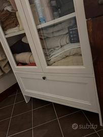 Armadietto con due ante a vetri, mensole e ampio cassetto. Molto capiente, utilizzabile cone mobile bagno o in cucina o come piu vi serve. Qualche piccolo segno di usura evidenziato in foto.