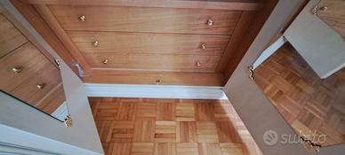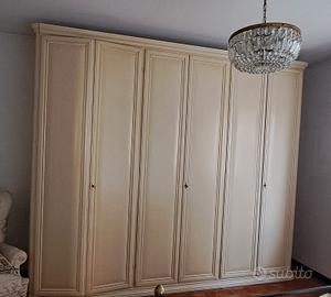 Armadio a 6 ante, completo di cassetti, specchio e ripiani. Misure: lunghezza 300 cm, larghezza 65 cm, altezza 256 cm.