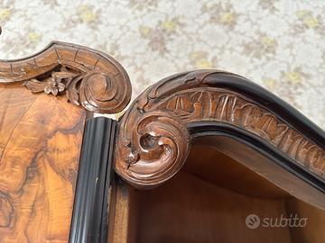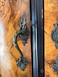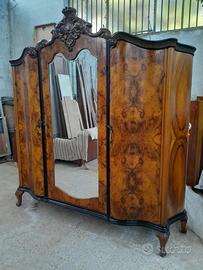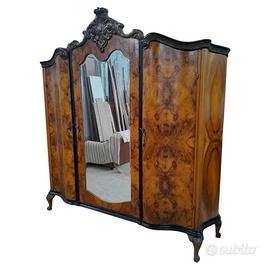 Armadio a tre ante con grande specchio in stile barocco piemontese dei primi del novecento in ottimo stato, in radica di noce con profili e cornici nere lucide, e maniglie con chiave in bronzo fuse. Faceva parte della camera da letto dei miei nonni devo regalarlo a malincuore per mancanza di spazio. Dimensioni: l.220 x p.65 x h.235 Si trova adesso in un capannone nell'entroterra di Savona, ritiro e imballo a carico dell'interessato.
