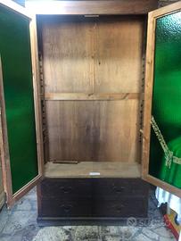 Armadio libreria in legno Anni '40 con sportelli in vetro e 4 cassetti - Altezza 210, larghezza 114, profondità 40. Originale e ben conservato ha solo uno dei vetri incrinato come da foto.