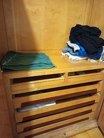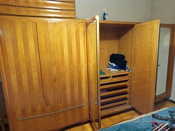 Vendo particolare armadio vintage, legno sano, cassettiera al momento esterna, da inserire. Altra cassettiera scorrevole come da foto. Coordinati due comodini vetro e legno.