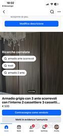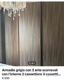 Armadio grigio 3 ante scorrevoli con interno due cassettiere e con 3 casetti misure 270 x 255 x 62