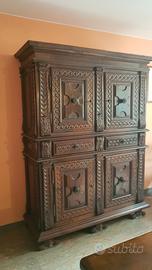 armadione in noce intagliato a mano tappezzato all'interno in Damasco giallo