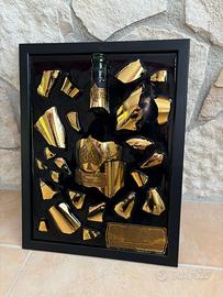 Opera artistica unica realizzata con bottiglia Armand de Brignac Gold originale, frammentata e ricomposta all'interno di una composizione su quadro.