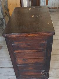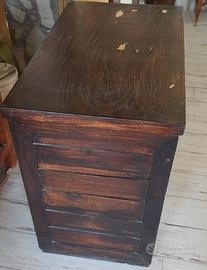 Mobiletto basso in legno massello dalla calda tonalità scura, ideale come piccola scrivania, consolle da ingresso o porta TV. Il design richiama lo stile rustico dei mobili Tansu giapponesi, con linee pulite e una struttura robusta. Il mobile è dotato di due pratici cassetti frontali con maniglie integrate nel legno, perfetti per organizzare piccoli oggetti. Dimensioni: Larghezza: 71 cm Profondità: 42 cm Altezza: 64 cm Dettaglio cassetti: Altezza 7 cm Condizioni: Il mobile è in buone condizioni strutturali. Presenta alcune piccole imperfezioni dovute al tempo che ne sottolineano il carattere vintage e l'autenticità del materiale (ideale anche per chi ama progetti di restauro o restyling) trattabile