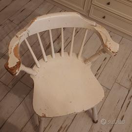 Sedia Windsor con braccioli. Questo modello classico, noto per lo schienale a fusi (o bacchette) inseriti in un anello curvo e per la seduta sagomata, è tra i design di sedia più diffusi e storici.