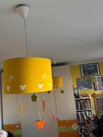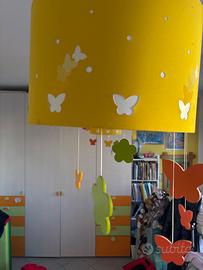 Telaio rivestito in tessuto giallo con forme di farfalle fiorellini, presenza con pendenti in legno colore arancio verdolino e giallo ( vendita di entrambi costo 50€ vendita lampadario singolo 30€)