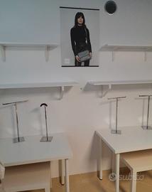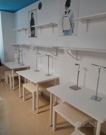Arredo completo in ottimo stato di: 10 tavoli, 20 tavolini, 40 mensole di tre misure complete di reggimensole, 1 specchio in ferro, 3 vetrine aperte, 8 stend. Vendibile anche separatamente.