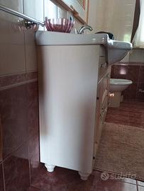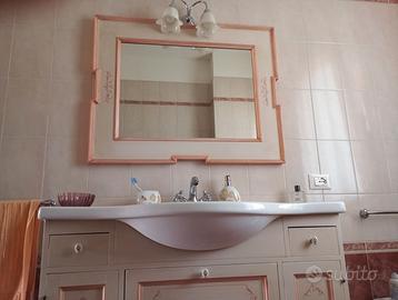 Mobile bagno con 2 ante, 4 cassetti e 1 ribalta con pomoli in ceramica (h 85 e p 35 cm ) con lavabo della lunghezza di cm 120 specchio arredo di 80 x 100 cm (tutto con decoro fiorentino), quest' ultimo sormontato da luce doppia con vetro scavo puntinato rosso.