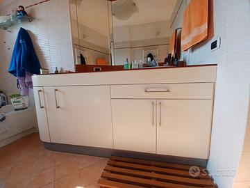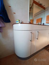 mobile sottolavabo composto da cassetto e antine, mobile per lavatrice e mobiletto angolare. Tali mobili sono predisposti come arredobagno di pianali in muratura oppure necessitano di un pianale di appoggio sovrastante. Tutto l’arredobagno è in legno di alta qualità laccato RAL 1013 e prodotto da un artigiano.