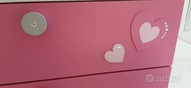Cedo questi bellissimi mobili, serie Barbie marca Doimo, pari al nuovo, composti da settimino, scrivania, specchiera con 8 luci led a tema e comodino a 2 cassetti e mensola robustissima con decori, lunghezza cm 120,tutti con didascalie in rilievo con incastonati veri zirconi di Swarovski.