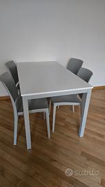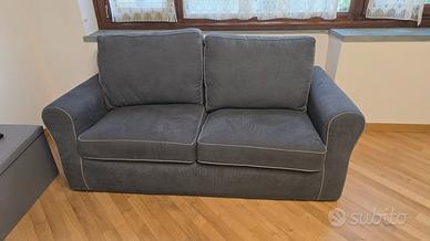 Divano imbottito di tessuto colore grigio con cuciture ,sfoderabile. Tavolo con ripiano in medio densit bianco e piedi in alluminio verniciato . Numero 5 sedie grigio chiaro. Letto e materasso armony con due comodini .Tutto come nuovo