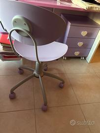 Scrivania in legno color lilla e bianco Cassettiera lilla con maniglie a forma di cuore color bianco Parete lilla con piccole mensole a forma di cuore Sedia girevole lilla