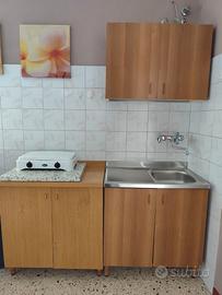 CUCININO con lavello, stipetti e fornello gas a due fuochi con tavolo e sedie.
