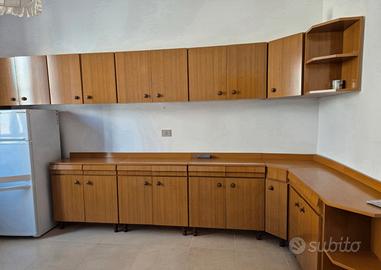Cucina a gas con fornelli, lavandino, forno a gas , lavatrice e frigorifero.