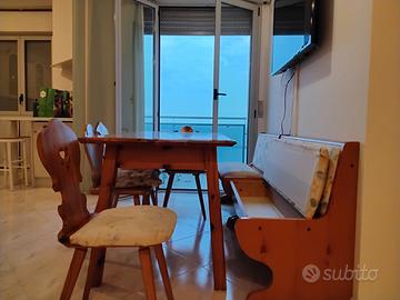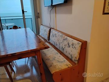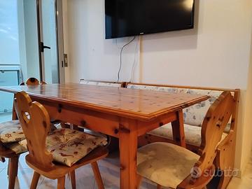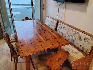 Vendesi arredamento realizzato artigianalmente in vero legno di pino così composto: tavolo (cm 80 x 160) e 6 sedie con intaglio schienale e sedute imbottite, due panche con vano sotto sedute (una lunga 90 cm e l'altra 1,40 m circa) e una credenza intagliata e dipinta a mano, larga 180 cm.